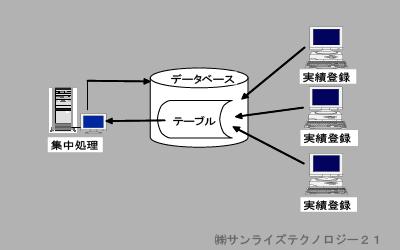 生産あるいは受入の実績、払出し実績、在庫移動、出荷実績、受注データ登録などの処理を一台のパソコンが集中して行います。実績登録する各クライアントは、設定により、登録内容をサーバにある「読込み用中間テーブル」に書き込みます。