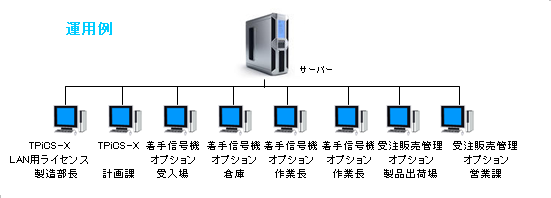 ●TPiCS-X が動くLAN環境の中で、現場の作業長さん 班長さん あるいは 出荷場の担当者の机の 上に置いたパソコンで動きます。